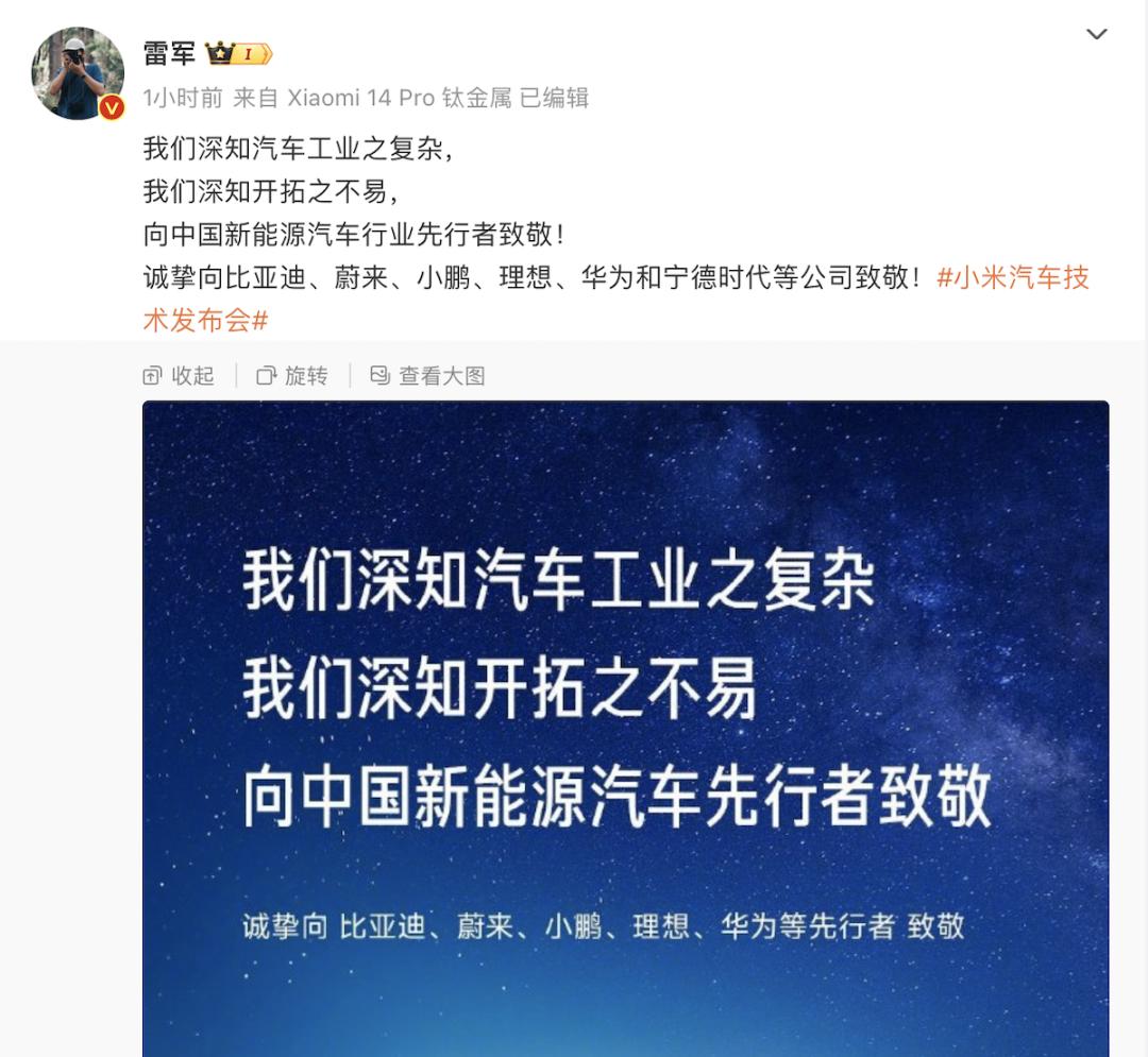 此外,小米也十分尊重在造车新百年中作出贡献的“友商们”,在小米汽车技术发布会的前一天,雷军个人、小米汽车官方都分别发文向中国新能源汽车先行者致敬。