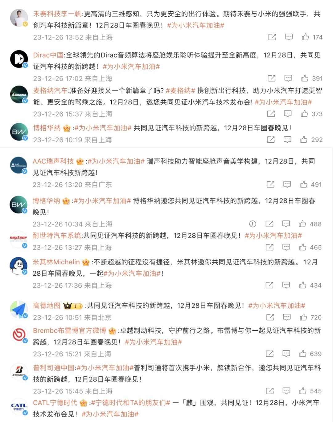 值得一提的是小米汽车官方微博在26日官宣技术发布会后,评论区中高德地图、Brembo布雷博、普利司通、AAC瑞声科技、CATL宁德时代、博格华纳、耐世特汽车系统、米其林、Dirac中国、麦格纳汽车、禾赛科技等汽车供应链官方微博(排名不分先后)纷纷转发微博为小米汽车技术发布会做宣传,可谓是排面拉满。