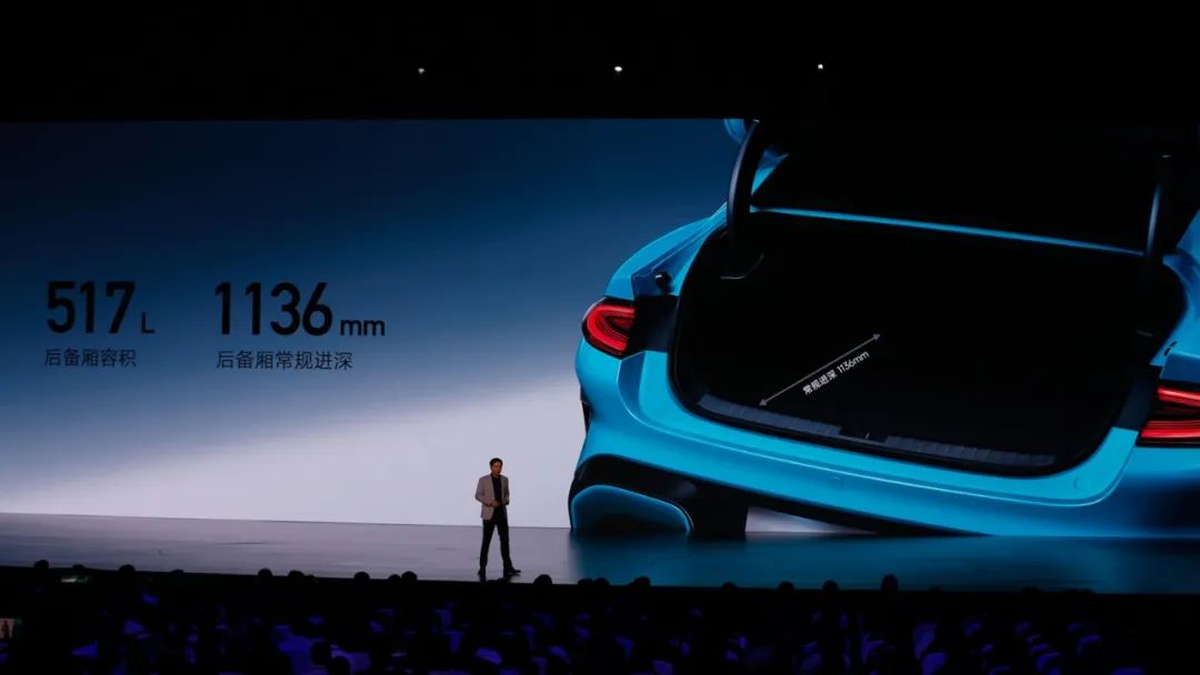 而在车内空间方面,雷军提到小米SU7「穿衣显瘦,脱衣有肉」,车内空间十分宽裕。同时在储物空间上后备箱517L容积和1136mm进深。此外,小米SU7也具备超大的105L前备箱。