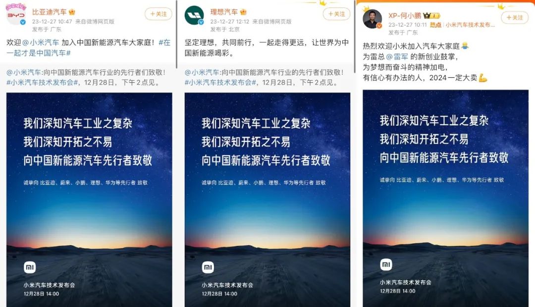 对此,比亚迪汽车、理想汽车官微,何小鹏本人微博纷纷回应支持小米汽车。