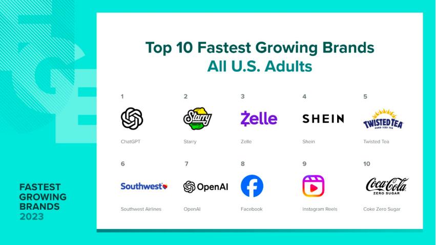 比如在“全美十大增长最快品牌”中,SHEIN前的ChatGPT(新一代生成式AI对话应用)、Starry(百事旗下的柠檬酸橙软饮料)、Zelle(美国版支付宝),以及位列其后的OpenAI 、Facebook、Instagram、CocaCola,在全世界都有极高的品牌影响力。