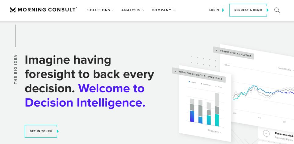 我去搜索了一圈,发现Morning Consult在众多咨询机构中算一家“另类”。2014年成立至今,不到10年间已成为美国著名的民调咨询机构。它给自己的定位是科技驱动的决策情报公司,基于自主研发的 技术,包括机器学习和自然语言处理解决方案,与领先的高频数据集配对并访问全球超过 1 亿人,进而给领导者提供智能数据助力其更快速更有效决策。
