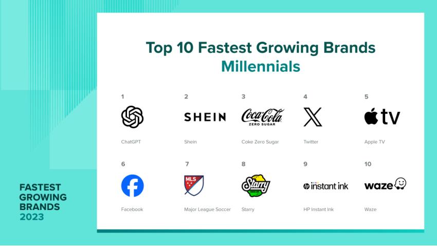 而在“千禧一代中十大增长最快品牌”中,除了SHEIN外还有ChatGPT、X(Twitter)、可口可乐、AppleTV、Facebook、MLS(美国职业足球大联盟)、WAZE(美国版百度地图)等品牌,覆盖了用户吃穿住行、娱乐社交等生活的方方面面。