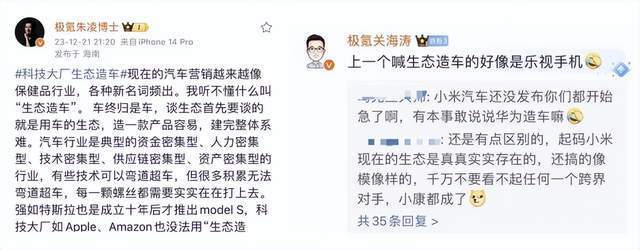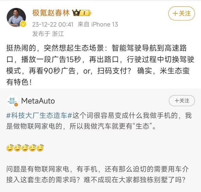 朱凌虽然没有点名小米汽车,但极氪副总裁赵春林之后连发两条微博公开点名怼“米生态”。他表示:“突然想起生态场景:智能驾驶导航到高速路口,播放一段广告15秒,再出路口,行驶过程中切换驾驶模式,再看90秒广告,or,扫码支付?确实,米生态蛮有特色!”