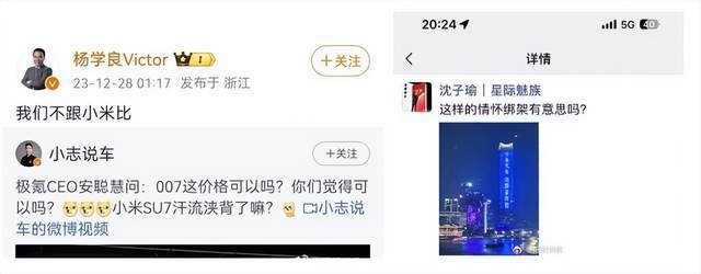 随着吉利集团高管“我们不和小米比”等言论的发酵,两家品牌被推上了风口浪尖。目前,杨学良已经删除或隐藏了相关微博。但网上传出了吉利旗下公司——珠海星纪魅族科技董事长沈子瑜在朋友圈转发小米海报并表示:“这样的情怀绑架有意思吗?”