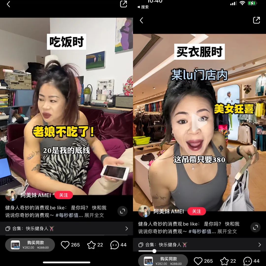 健身人的消费观:吃饭时 vs 买健身服时 来源:@小红书阿美妹AMEI