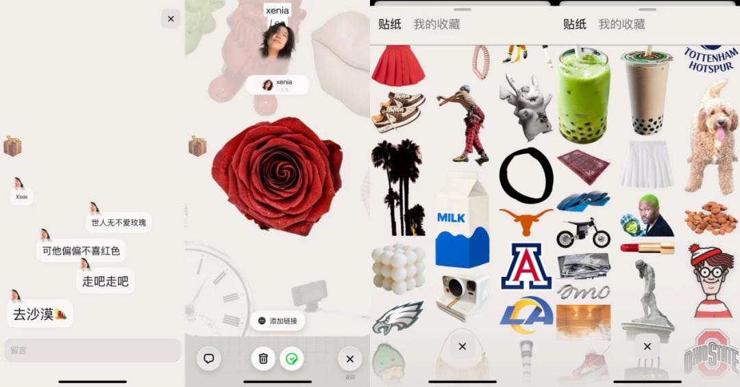 用户可以将贴纸、照片、文字、绘图等内容投射到自己或者好友主页完成装饰。贴纸涉及食品、家具、动物、摆件、服饰、玩具、水果蔬菜、美妆等多种品类,颜色和造型非常丰富。