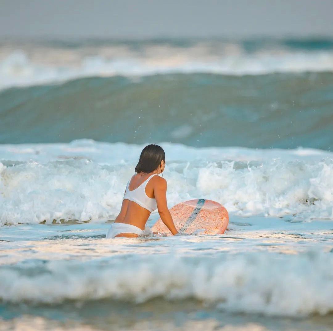 除踏浪外,Romy还着迷于双脚踩在沙滩上,感受“沙粒在脚底轻轻按摩,仿佛释放了一种根植于大地的能量,特别grounding。”