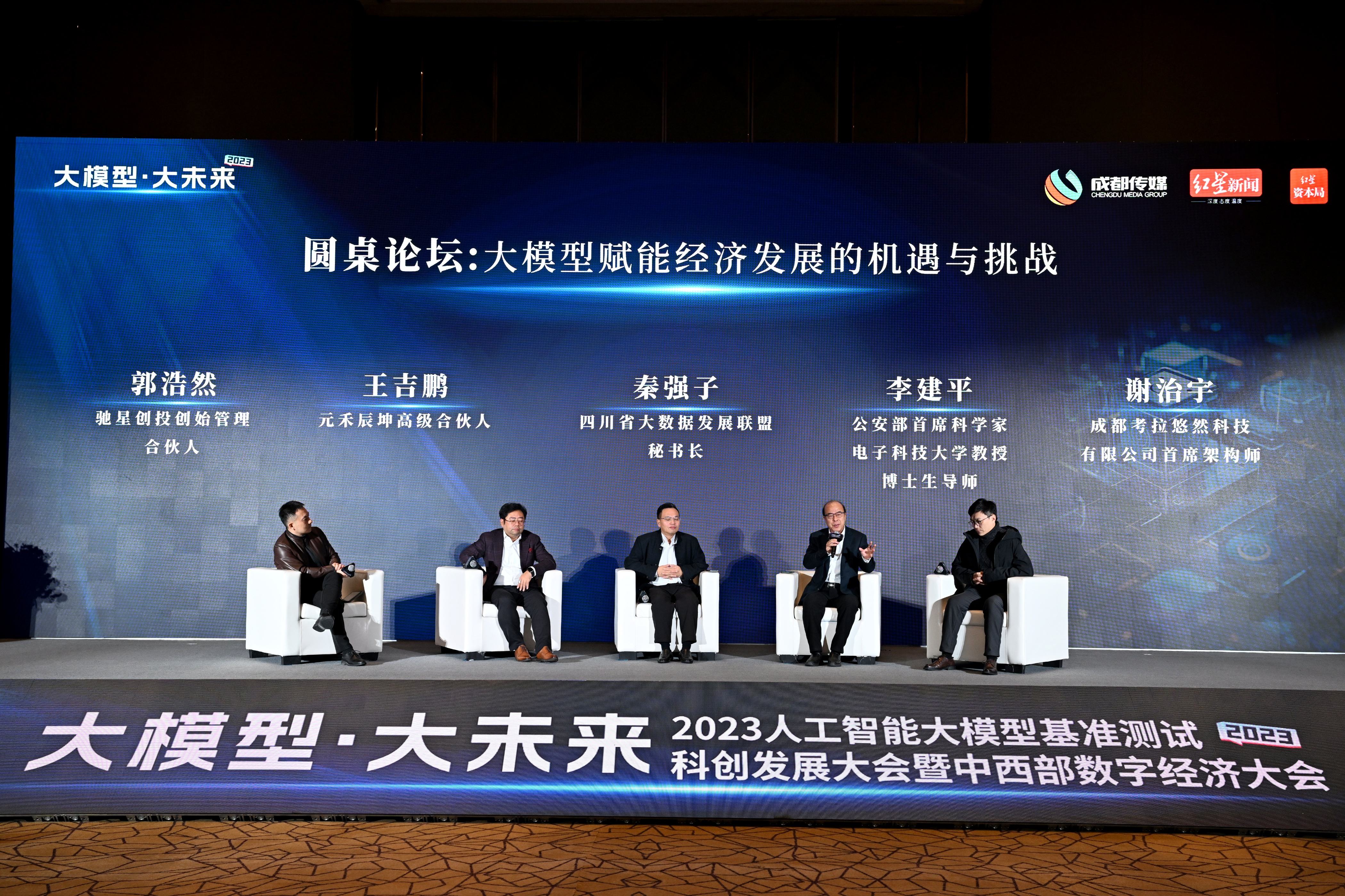 同时,代表产、学、研、资的四位嘉宾——元禾辰坤高级合伙人王吉鹏,四川省大数据发展联盟秘书长秦强子,公安部首席科学家、电子科技大学教授、博士生导师李建平和考拉悠然科技有限公司首席架构师谢治宇以《大模型赋能经济发展的机遇与挑战》为题,在驰星创投创始合伙人郭浩然的主持下展开圆桌讨论。