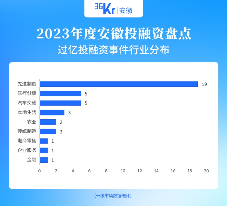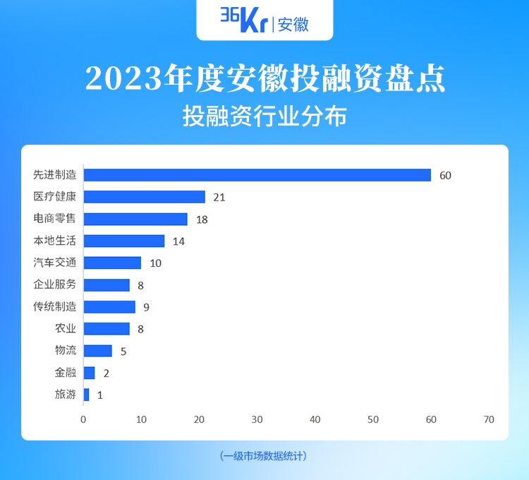 从行业来看,一级市场中,安徽融资轮次前三的赛道分别是先进制造(60起)、医疗健康(21起)、电商零售(18起)。