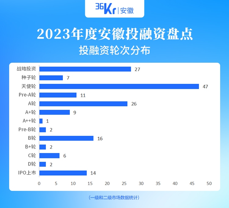 36氪安徽根据IT桔子、鲸准、36氪等公开渠道数据,截至12月29日,梳理、收录了安徽2023年一级市场和二级市场的投融资事件170起(仅统计公开披露的投融资事件,且不包含并购、上市后投资及退出),其中一级市场156起,二级市场14起,涉及11个行业,希望通过对安徽投融资表现的记录与回顾,为产业解读及未来展望提供新的视角。