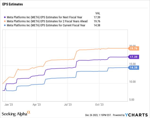 如下图所示,分析师目前一致估计 Meta 在未来几年内每股收益将大幅增长。到 2024 年底,该股将根据 2025 年每股收益 19.76 美元的共识目标开始交易。