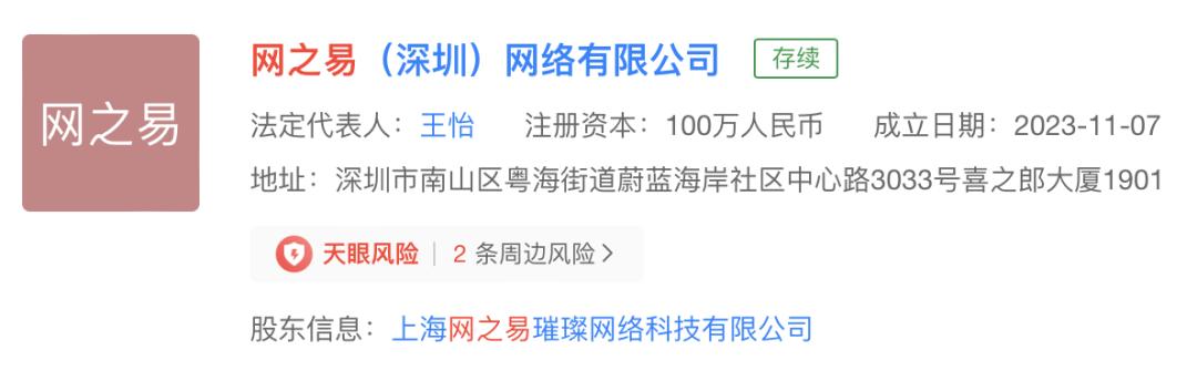 再比如,12月29日晚间多家媒体报道称,据天眼查显示,网之易(深圳)网络有限公司已于2023年11月7日成立,法定代表人为网易公司高级副总裁王怡。