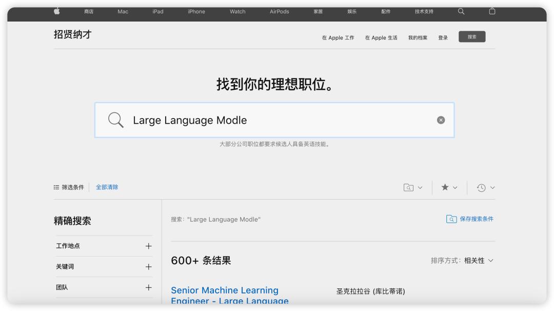 通过 Siri 打通 AI 的方法不好用,于是苹果就加大更多关于大模型研究人员的招聘。在苹果官网查询,光是相关岗位就超过 600 个。