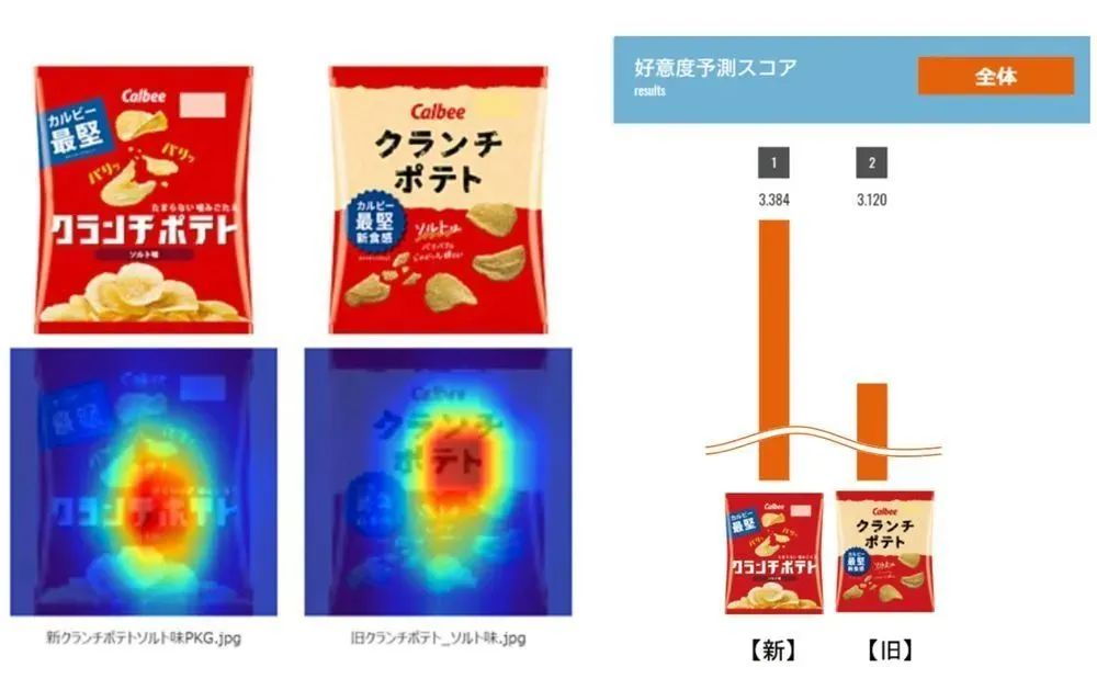 而PLUG AI的厉害之处,还在于它可以用热成像、统计学上的离散程度分析等技术提前预判众多款式的设计中哪一款受欢迎程度最高,降低试错成本。靠着这一技术,PLUG AI曾经帮日本零食品牌Calbee的新品Crunch Potato调整出了新包装,产品销量增长135%。