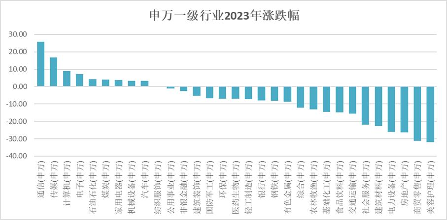 分行业来看,申万一级行业数据显示,通信、传媒、计算机、电子涨幅居前,其中,通信板块以25%涨幅领涨A股,跌幅较大的板块是美容护理、商贸零售、房地产、电力设备等。