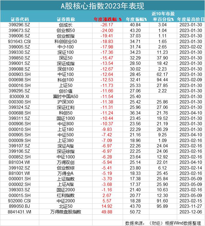 核心指数中,为数不多的翻红指数包括红利指数、微盘股行情带动下的中证2000、北证50。Wind微盘股指数全年上涨近50%。