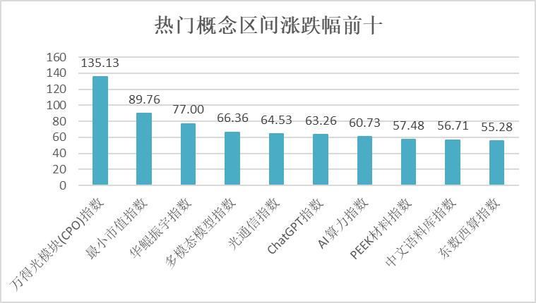 从万得热门概念指数涨幅前十和跌幅前十板块可以看到,光模块指数以135%涨幅遥遥领先。此外,涨幅较高的概念板块还有最小市值、华鲲振宇、多模态模型、光通信、ChatGPT、AI算力、PEEK材料、中文语料库、东数西算等。