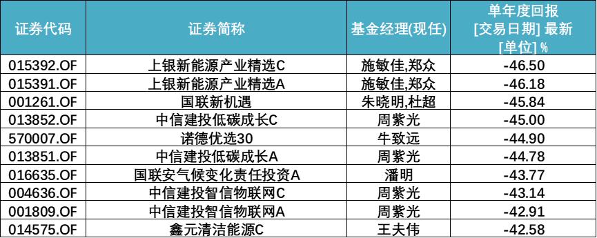 跌幅榜中,回报率排名后十的基金中,其亏损均超过了40%。其中,由上银基金基金经理施敏佳和郑众管理的上银新能源产业精选C以-46.5%的收益率垫底。