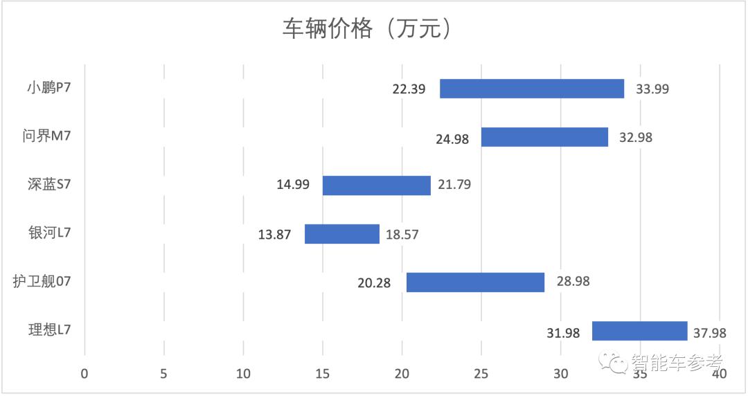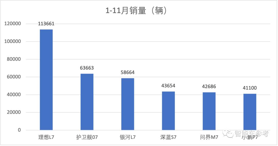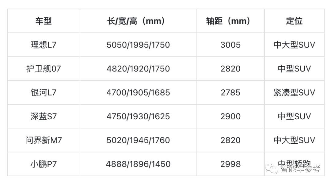 总体有6款车,SUV包括理想L7、问界M7、银河L7、深蓝S7(包括S7i)和护卫舰07,轿车有小鹏P7(包括P7i)。