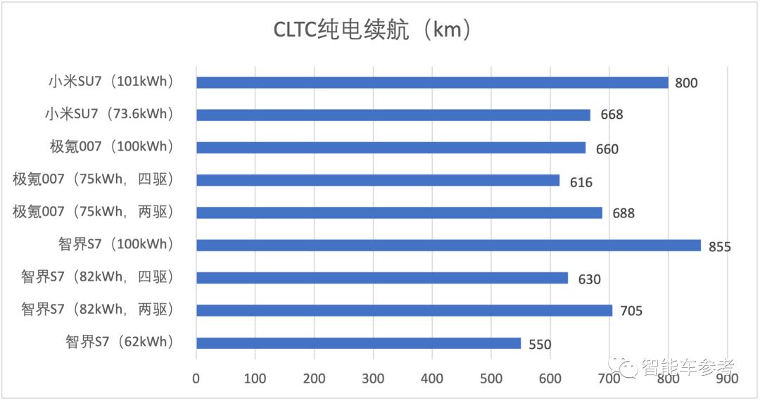 智界S7提供三种电池包容量,分别为62kWh、82kWh和100kWh;极氪007则提供2种,分别为75kWh和100kWh;小米SU7同样为两种,分别为73.6kWh和101kWh。