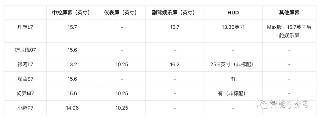 而车内屏幕,超过10英寸的中控是标配,银河L7、问界M7和小鹏P7还有仪表屏幕,理想L7和银河L7还有超过15英寸的副驾娱乐屏幕。