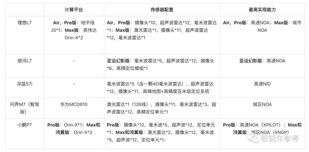 而在智能驾驶方面,除了护卫舰07和问界M7的非智驾版本只有基础的L2功能外,其余车型均支持高阶的智能驾驶。