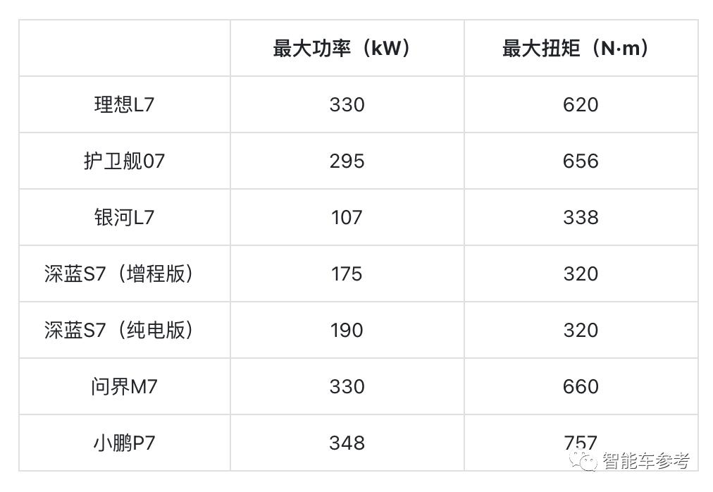 其中,深蓝S7和银河L7都只提供单电机两驱车型;理想L7全系标配双电机四驱;其余3款则提供两驱和四驱两种版本,电机最大功率和扭矩分别为:
