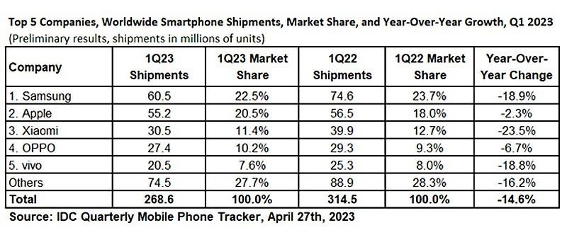 销量榜上排名靠前的头部玩家们,一直都是我们所熟悉的三星、苹果、小米、OPPO、vivo,2023年Q1的情况的确如此,虽然五大厂商都销量齐跌,但它们依然拿走了最大部分的市场份额。