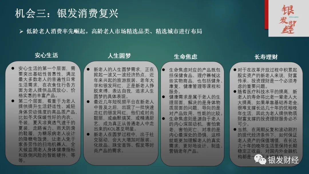 在银发人群人口、银发渠道重构之后,第三个机会是银发消费复兴。