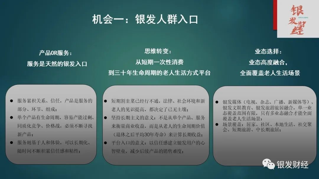 站在2023年末去看未来几年银发经济的机会,首先是抢占、打造银发人群入口,将以往银发经济中主流的各种老人短期一次性消费交易,转变为基于三十年生命周期的老人生活方式平台的运营。