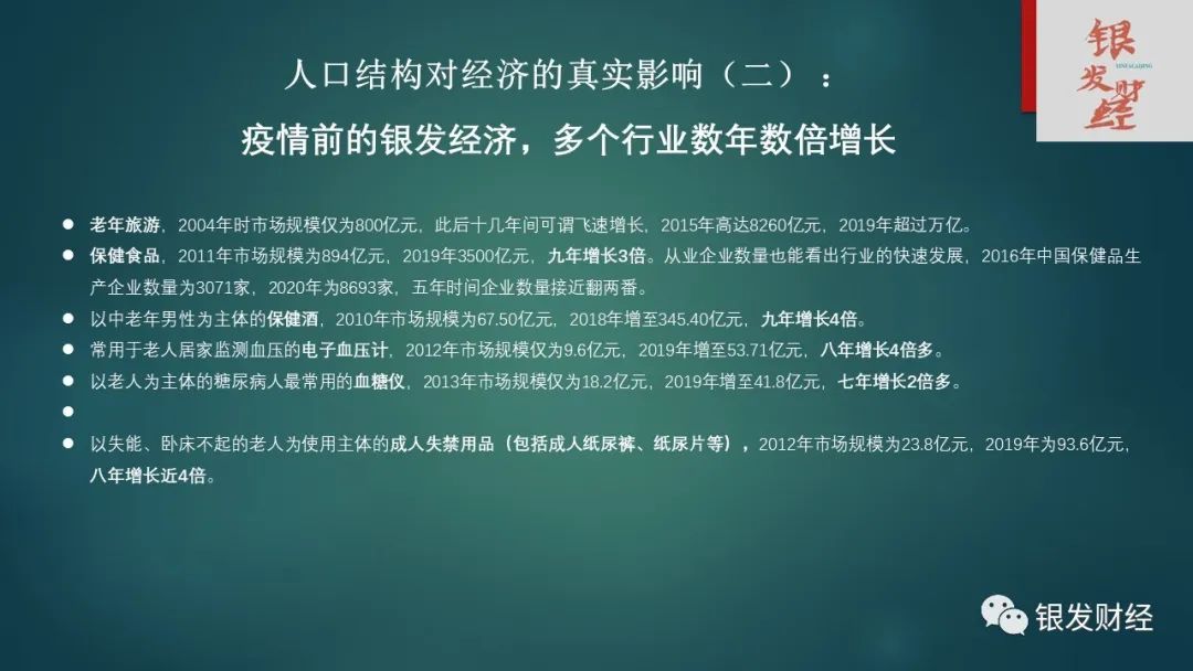 这群与1930-1940年代出生的“老老人”截然不同的“新老人”,每年有约2000万人进入退休阶段,将为银发经济的发展带来巨大的增量需求。他们不再追求极端低价,而是注重品牌、品质、体验,将使产品、服务的价格获得提升空间,企业能通过产品本身获得合理的利润空间,不需要再去通过强迫、诱导、以次充好等方式获利;在能够保证利润后,企业在产品品质、服务体验、品牌打造等方面也具备了提升可能,从而使企业经营走向正向循环。