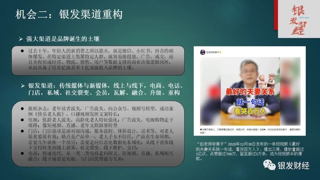当下银发渠道的现状是,传统主流渠道瓦解,正在积极转型寻求新路径;新兴渠道快速成长,有风险有潜力,但规模体量尚未充分体现。如果能够融合上述几种渠道的优势,既能够覆盖足够规模的老人数量,又能与老人建立起高频、高粘性、高信任感的关系,那么就能成为下一个十年主流的银发渠道体系,并成为孕育十亿、乃至百亿银发品牌的丰厚土壤。