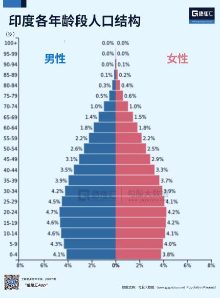 2022年,印度在年龄分布中,14岁以下儿童占28%, 15-64岁成年人口占64%,65岁以上老人仅占5.3%,属于典型的年轻型国家。 作为一个拥有14亿人口的超级大国来说,这样的人口结构堪称完美。