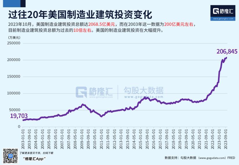 而在过去几年,美国的制造业建筑投资在以一个夸张的斜率飙升。
