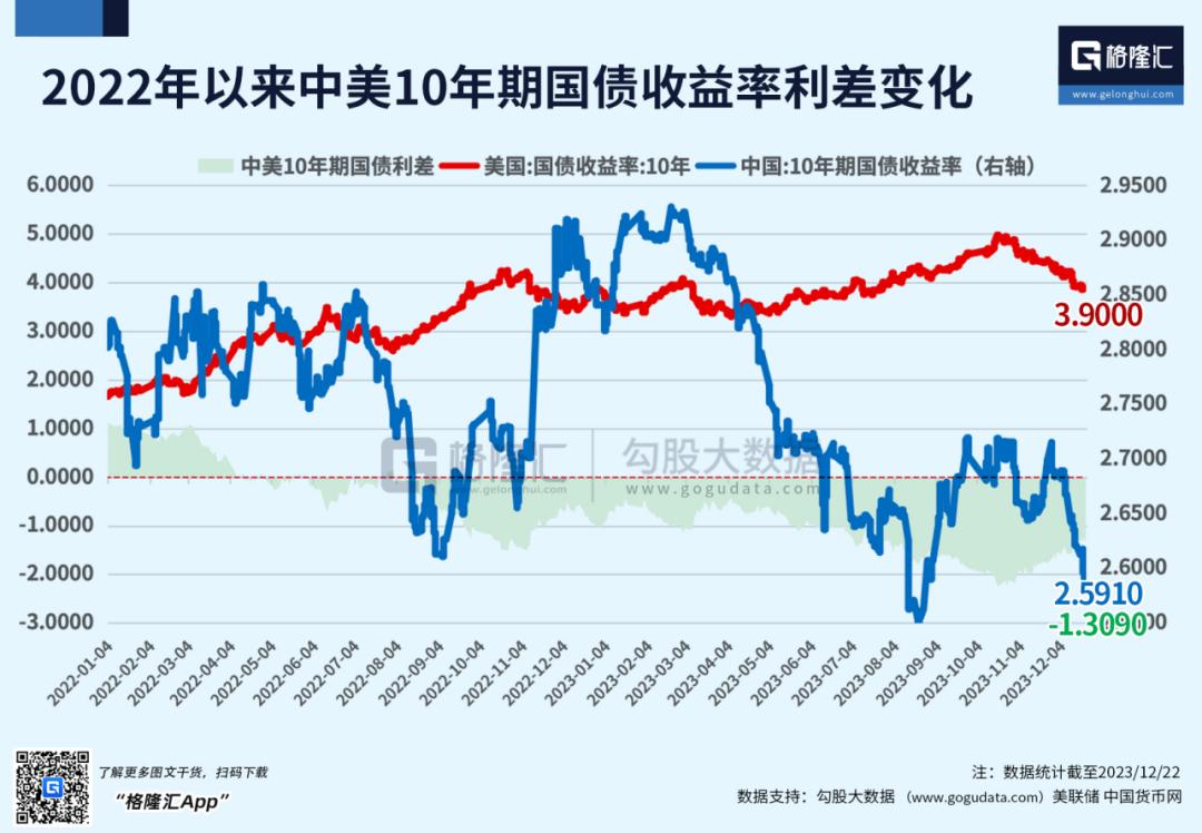 2023年,中美国债收益率倒挂是资本市场最关注的现象之一。美国十年国债收益率从3.3%一度飙升至5%再在四季度回落至3.9%,而我国的收益率从2.9%一路跌至2.59%,两者利差扩大创出新记录。