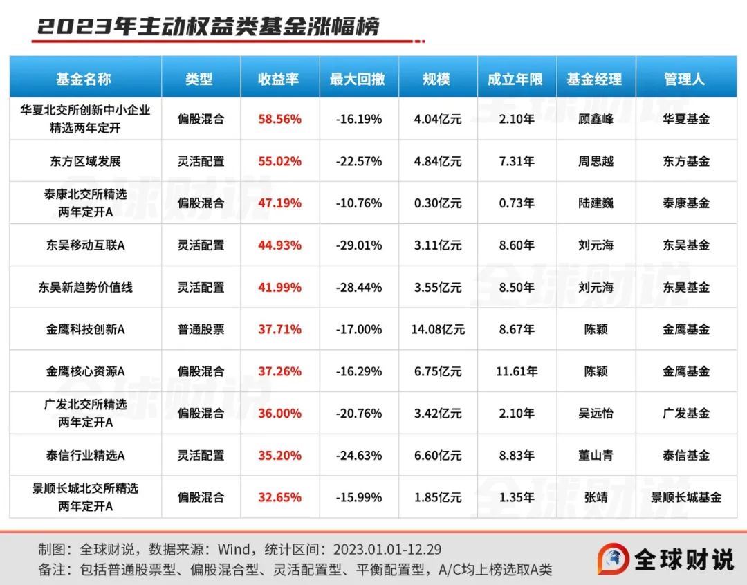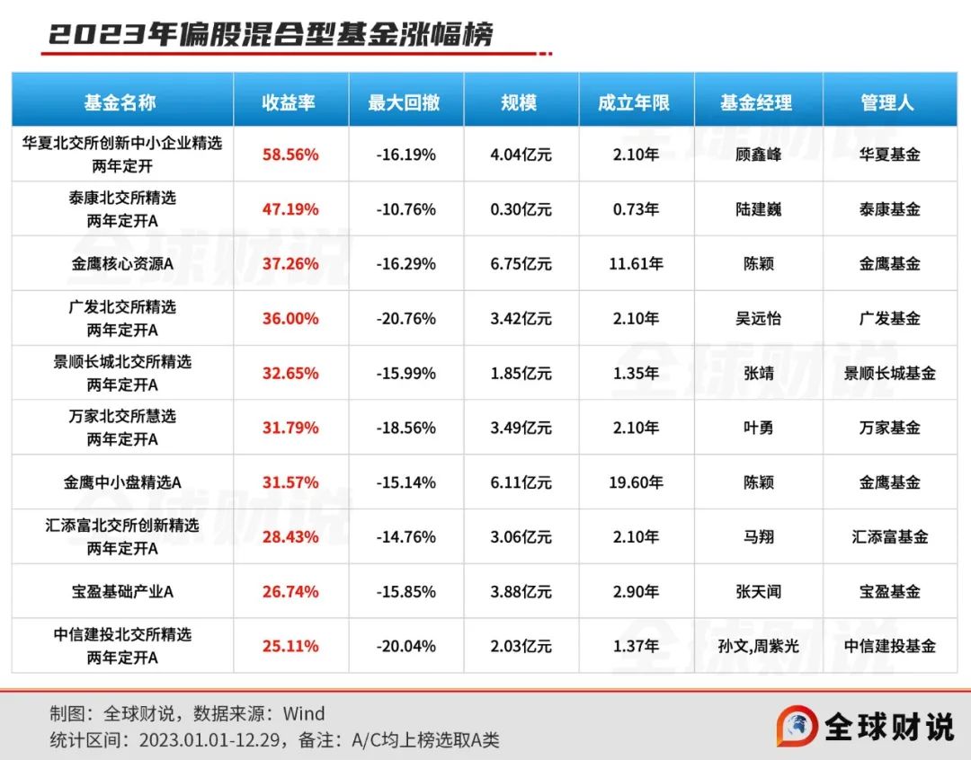 从截至2023年12月29日的最终结果看,顾鑫峰掌管的华夏北交所创新中小企业精选两年定开以58.56%的年度收益夺得主动权益类冠军。