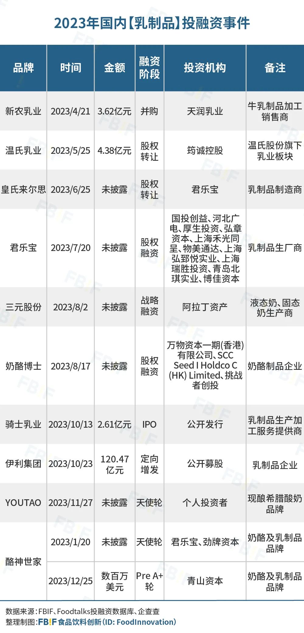 从融资阶段来看,乳制品行业投融资多为股权融资,企业大都在乳制品行业深耕多年,其中,骑士乳业在今年10月成功上市。据了解,骑士乳业成立于1992年,聚焦乳、糖产业,是一家集农、牧、乳、糖全产业链发展的综合性企业。