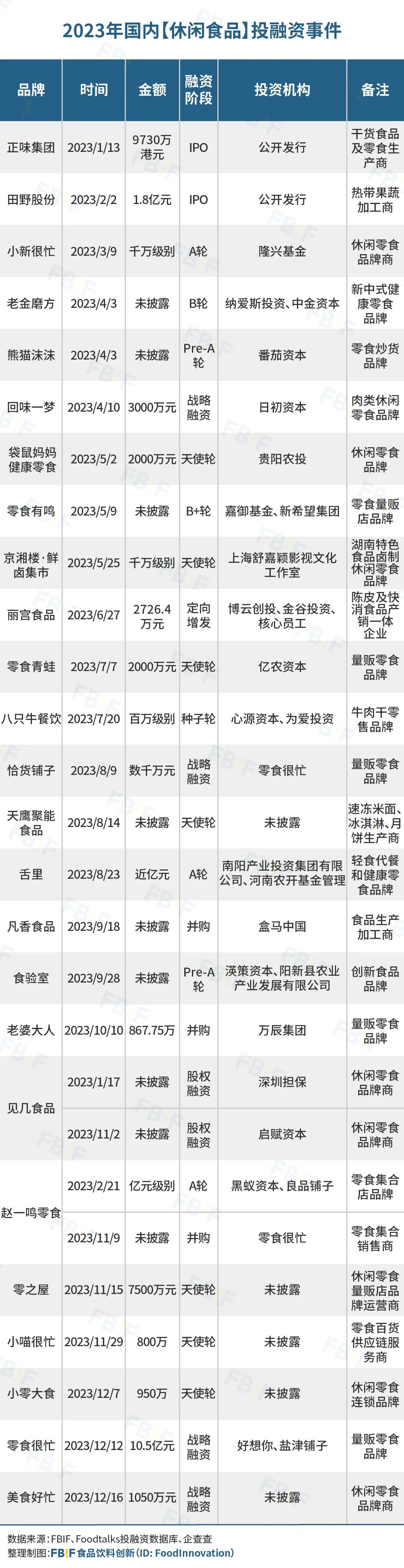 2023年,休闲零食品类共有26起融资事件,相比2022年为33起有所回落。其中,热带果蔬加工商田野股份和干货食品及零食生产商正味食品在今年成功上市。