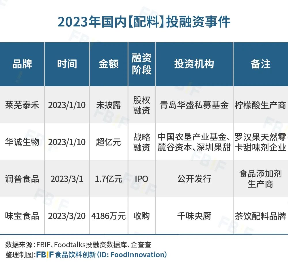 2023年,在配料品类上,有4家企业拿到新一轮融资,除了食品添加剂生产商润普食品外,其余三家均与新茶饮赛道有关。