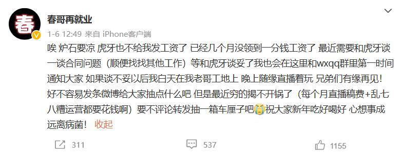 虎牙主播@春哥就曾抱怨称,自从去年11月暴雪宣布要退出中国后,平台官方就以“人气下滑”为理由停止给他支付工资。