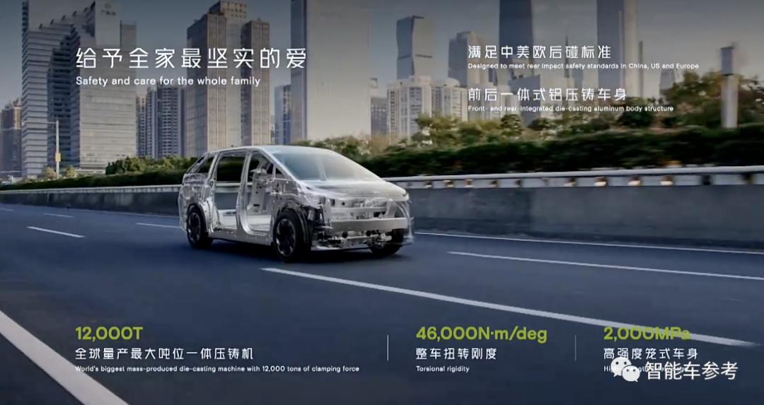 前后一体式铝压铸车身结构,整车扭转刚度提升3倍,弯曲刚度提升30%。减重30kg,减重比例19%。
