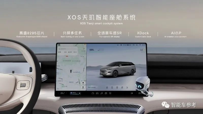 智能座舱层间,XOS天玑智能座舱系统,底层是高通8295芯片。车内首次采用的多任务系统架构,支持导航地图和多种应用的分屏形式,主副驾同时操作也互不干扰。