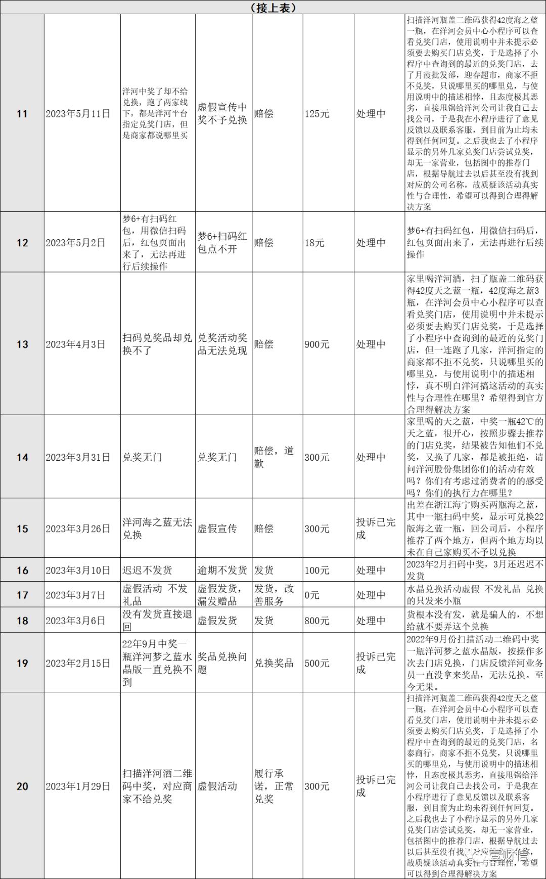 黑猫投诉平台上近一年内有关于洋河股份兑奖活动的投诉共计20条,目前仅有3条投诉内容状态为“已完成”,其余投诉问题的进度扔为“处理中”。