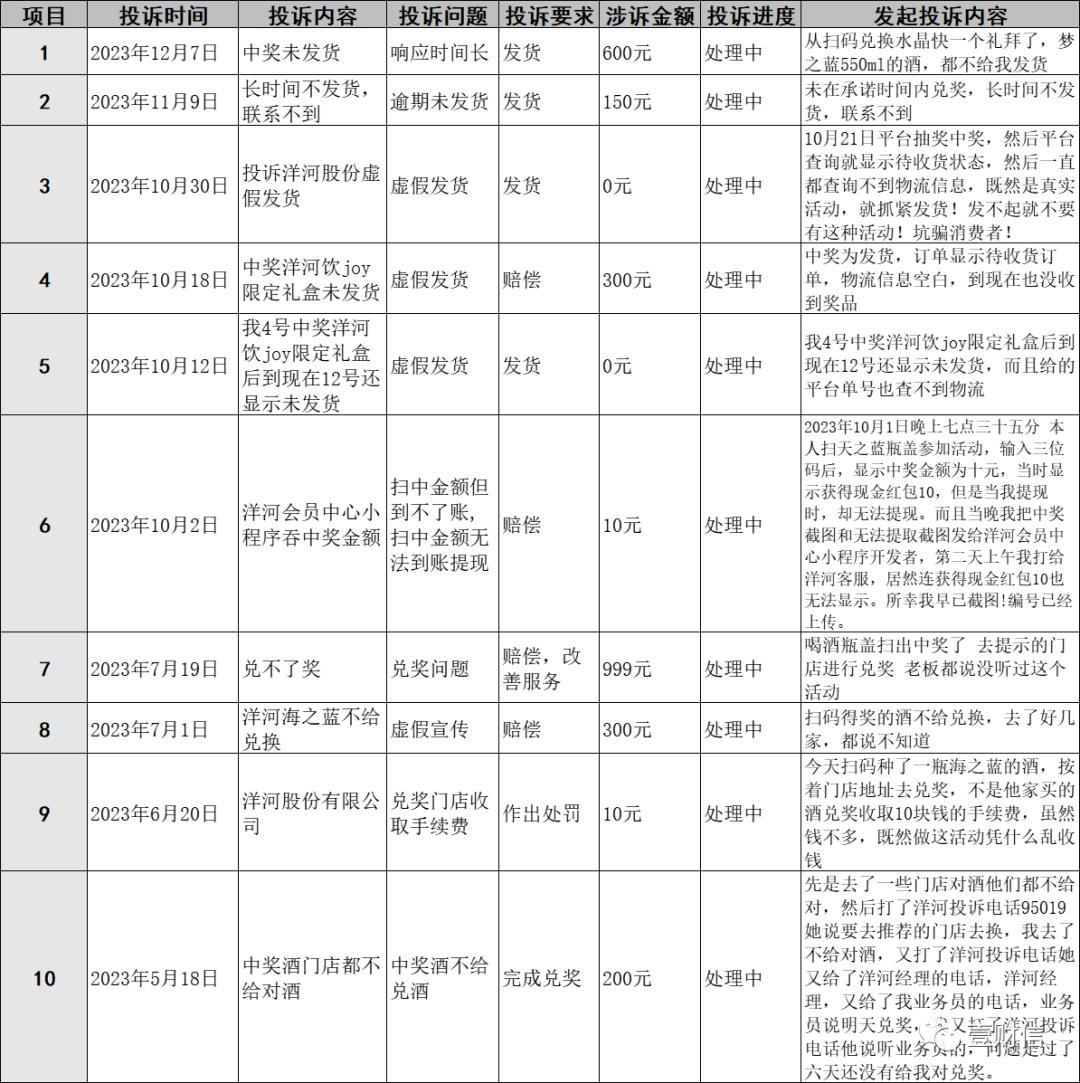 例如,有消费者在投诉平台上反映自己在参与洋河股份的扫码兑礼品活动时遇到了奖品迟迟不发货的情形,还有到平台指定线下门店兑奖遇到商家自称不知情、商家不予兑换、商家兑换却要求收取手续费、个别商家态度恶劣的问题,或是到洋河股份官方小程序显示的门店兑奖时却发现相关商铺处于非营业状态。为此,有部分消费者质疑洋河股份相关活动的真实性与合理性,还有消费者认为兑奖活动系虚假宣传,希望能够得到合理的赔偿。