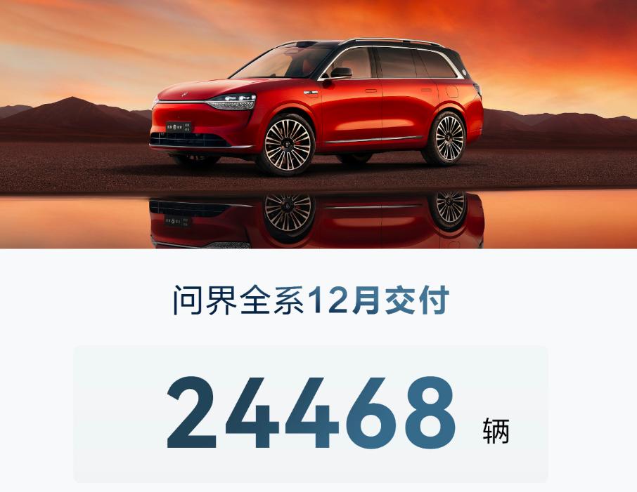 在新势力阵营,年底前冲出一匹黑马——华为鸿蒙智行的问界,12月全系交付新车共计24468辆,其中仅问界新M7就交付了20611辆,全年累计销售新车94380辆。