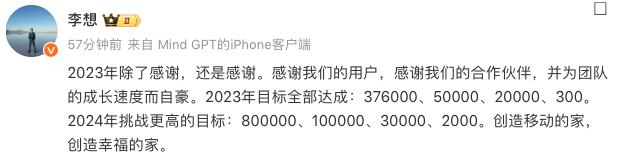 不仅如此,李想发文的同时,对即将到来的2024年立下了新的目标:“2024年挑战更高的目标:800000、100000、30000、2000”。