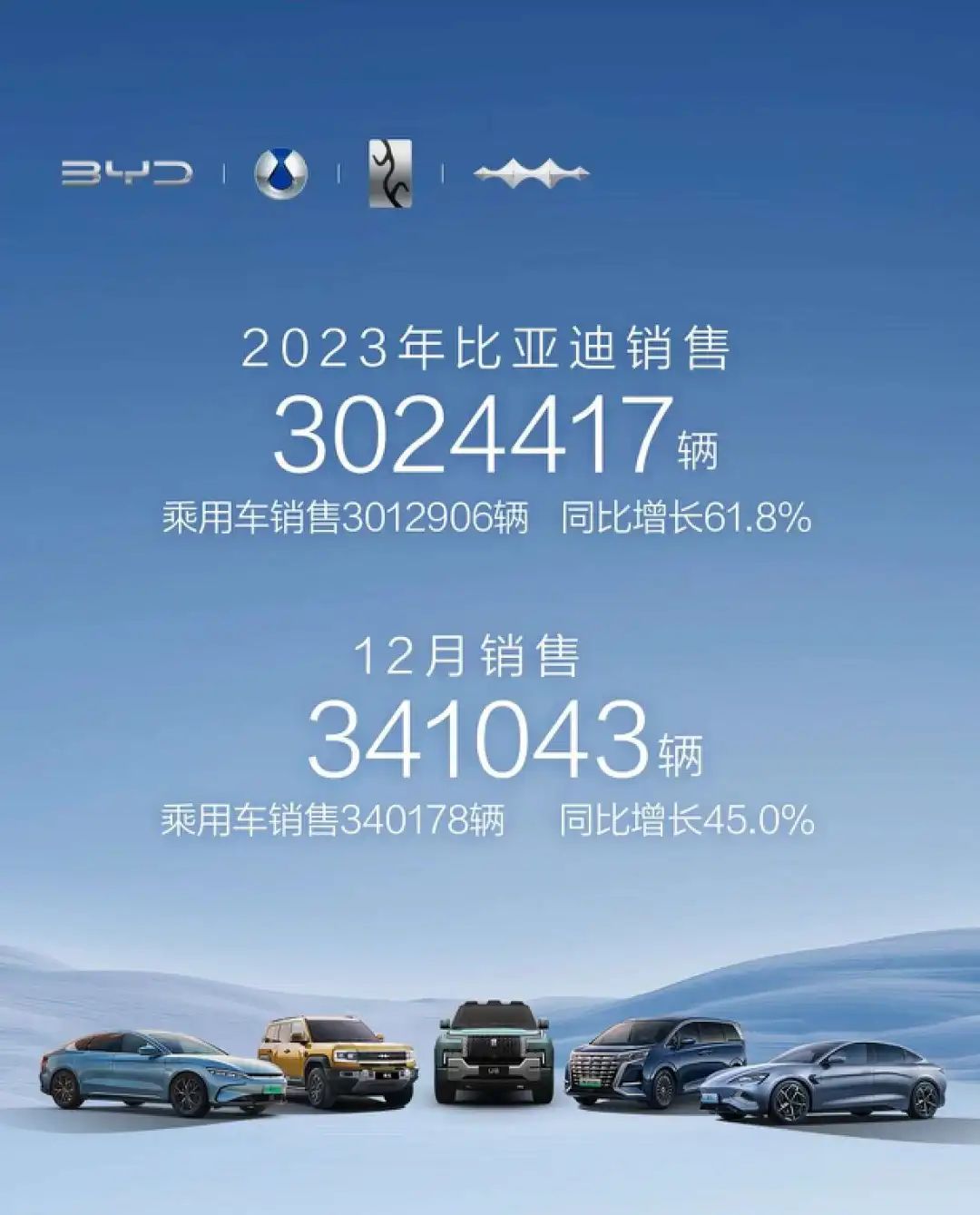 同样在新年第一天宣布完成销量目标的,还有国内新能源实打实的“一哥”比亚迪。