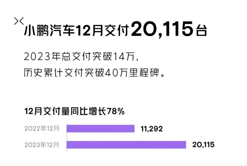2023年全年,小鹏汽车共交付新车141,601台,同比增长17%。截至2023年12月31日,小鹏汽车历史累计交付量达400311台,突破40万交付里程碑。