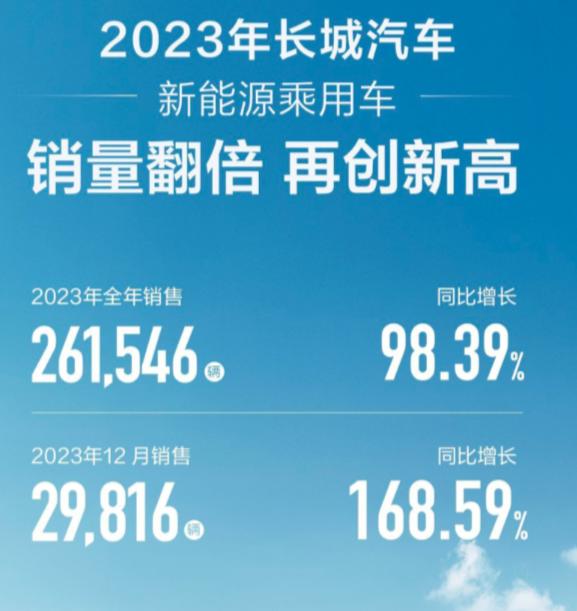 根据长城汽车公布的数据,12月新能源乘用车销售29.8辆,同比增长168.59%,但环比下降了4.3%,2023年新能源全年销量约为26万辆,同比增长98.39%。